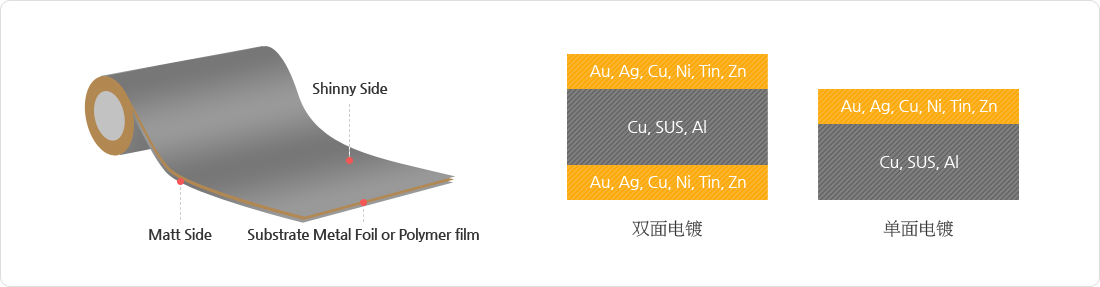 對于對用于電氣?電子零配件的金屬箔(Metal Foil),為了給予客戶要求的物性及化學特性,進行在單一金屬或兩種以上金屬上進行電鍍處理。通過連續生產線來組成的工程,在厚度為10-300?的金屬箔上可以進行電鍍處理,厚度為0.1-5?的多種合金。同時,本公司獨有的“粗化處理(Nodular Treatment)”技術通過調整金屬納米粉的大小及形狀可以加強與聚合物結合力,加上提高電氣特性。