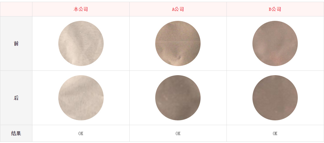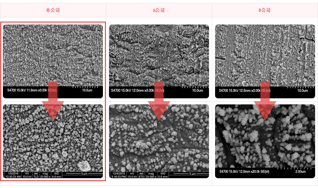 本公司為了增強結合力,形成細密的結節(Nodule數/μ㎡ – 本公司 〉 A公司 〉 B公司)。